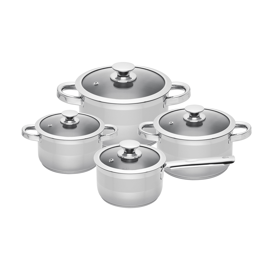 De Furore is een 4-delige pannenset die een tijdloos ontwerp combineert met praktische eigenschappen voor dagelijks kookplezier. Deze complete set is vervaardigd uit robuust roestvrijstaal en is volledig PFAS-vrij, wat bijdraagt aan een bewuste manier van koken. De combinatie van glanzend staal met glazen deksels geeft de pannen een karakteristieke uitstraling die in iedere keuken past.