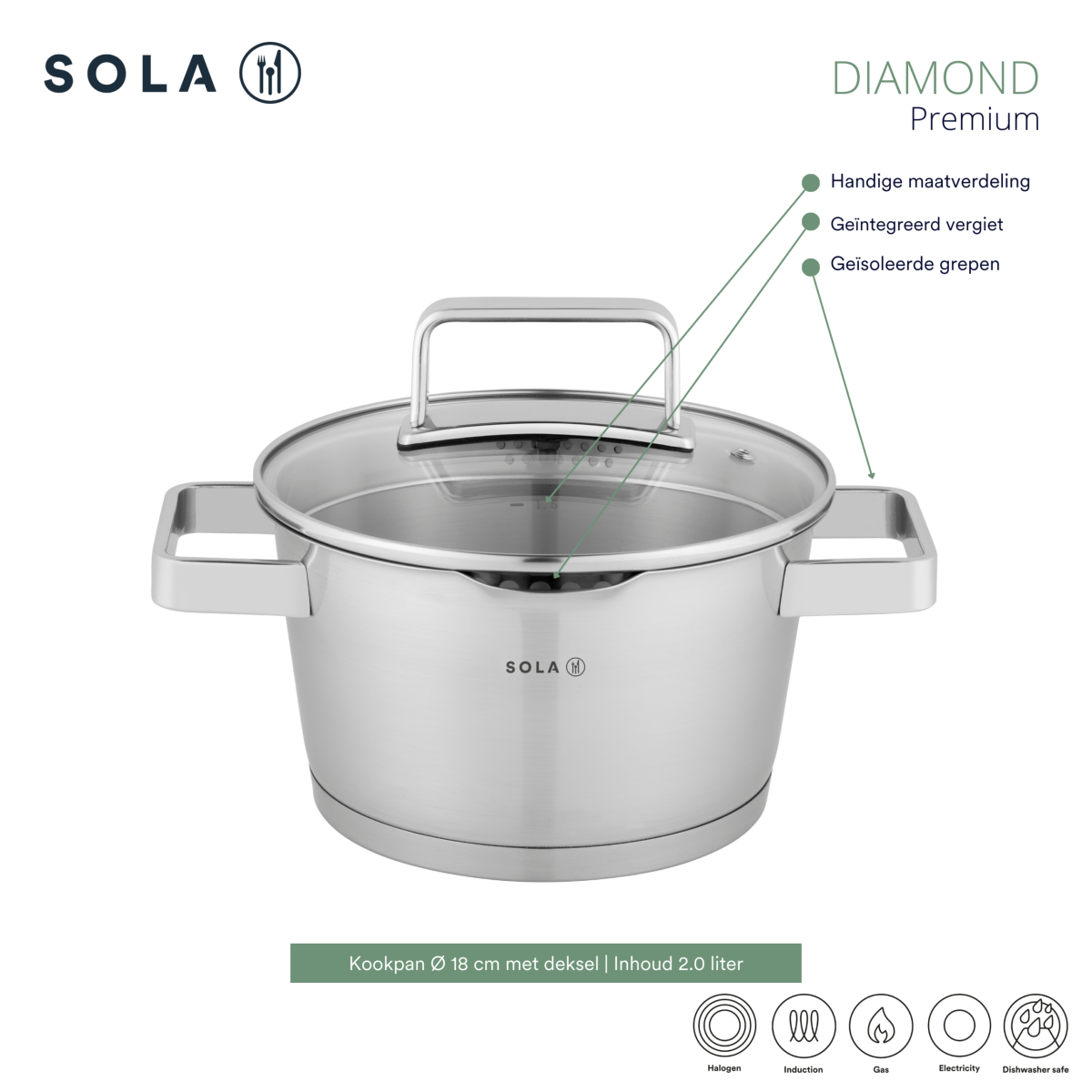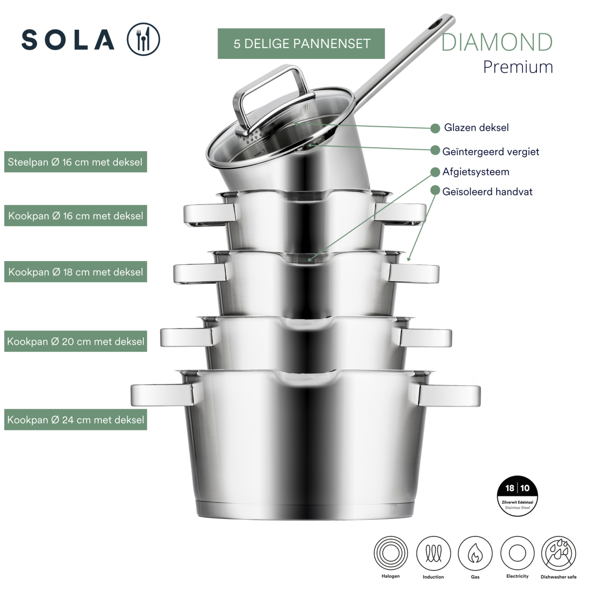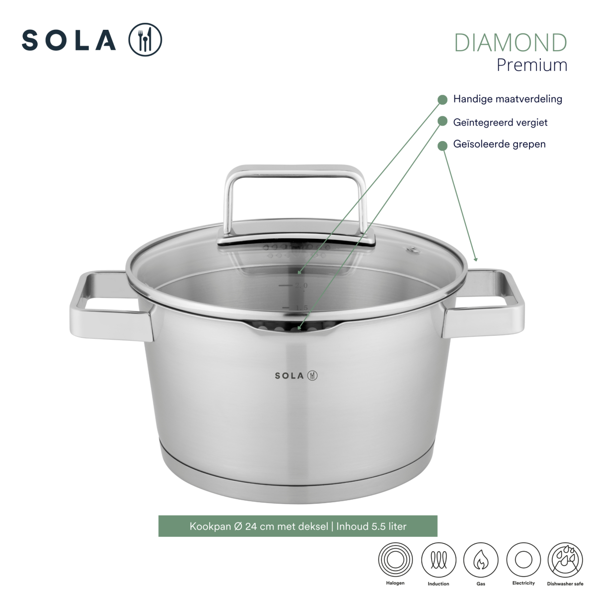 De pannen uit de Diamond set zijn vaatwasmachinebestendig, wat het schoonmaken vergemakkelijkt. Voor een lange levensduur adviseren we om de pannen na het reinigen altijd goed droog op te bergen. Omdat Sola staat voor degelijkheid, ontvangt u op deze pannenset 10 jaar garantie op materiaal- en/of fabricagefouten.
