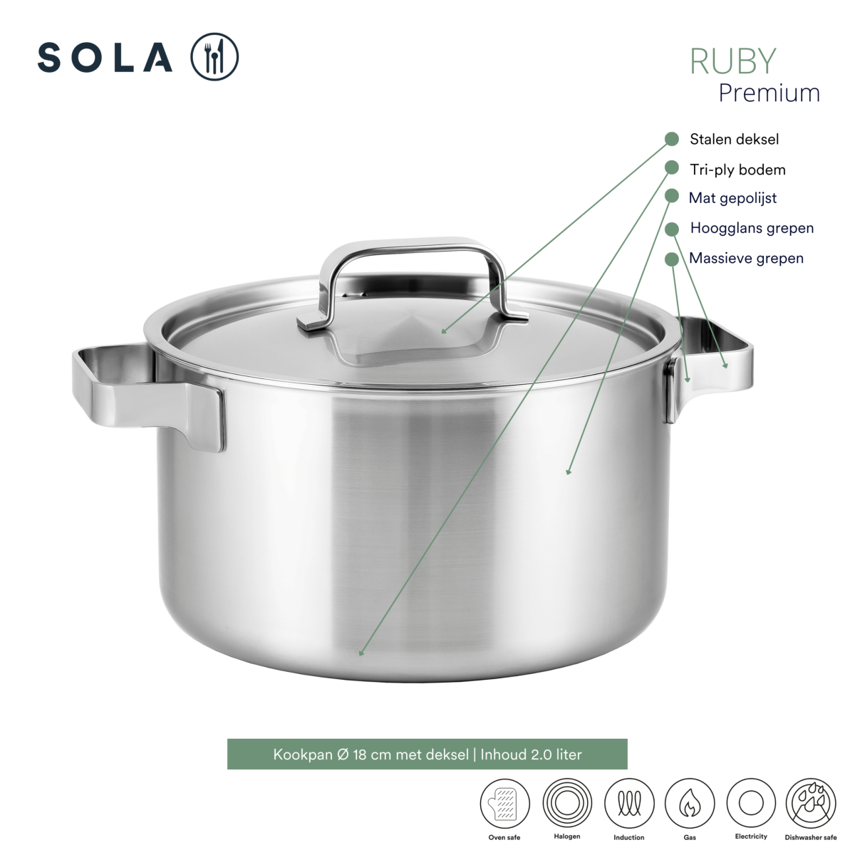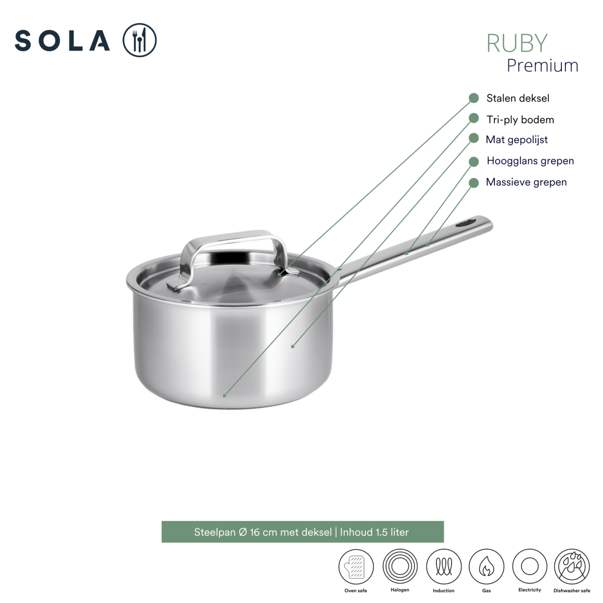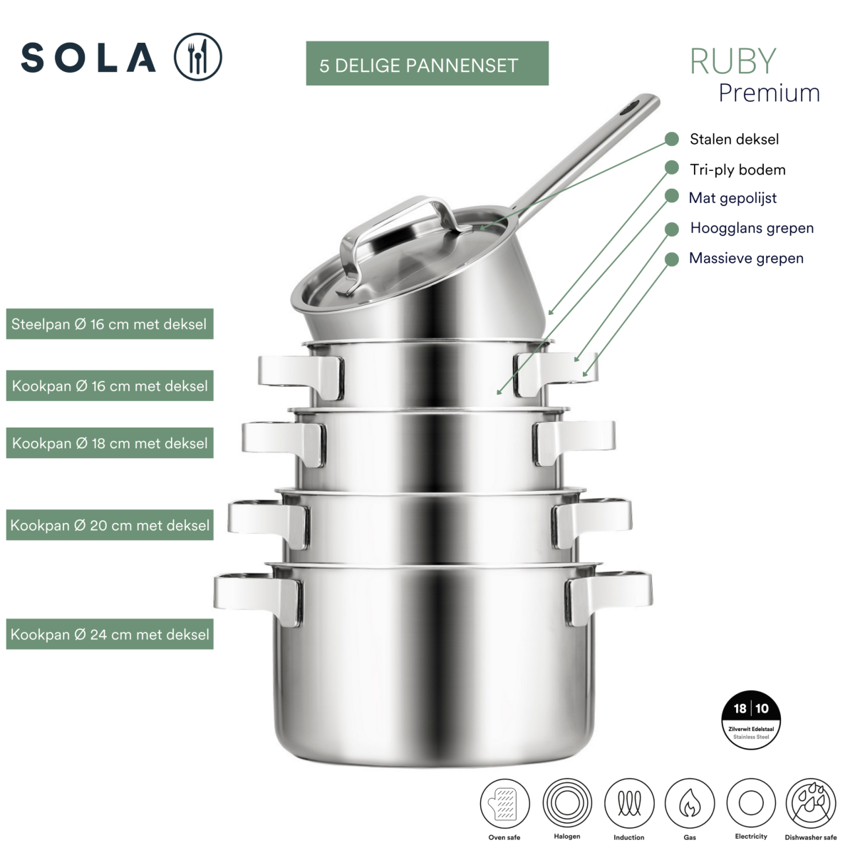 De Sola Ruby 5-delige pannenset is een kwalitatief hoogwaardige en complete set voor de thuiskok. De pannen hebben een zware, degelijke uitvoering en een nette afwerking. Omdat de set verschillende formaten kookpannen en een steelpan bevat, heeft u voor elke maaltijd de juiste pan bij de hand. Deze set is een praktische basis voor iedere keuken.