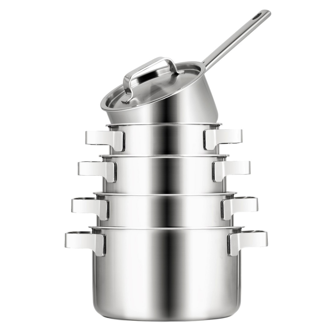 Deze pannenset is ontworpen voor dagelijks gemak. De pannen zijn geschikt voor alle warmtebronnen: gas, elektrisch, keramisch en inductie. De stevige roestvrijstalen handgrepen zorgen voor een veilige grip tijdens het koken. Na gebruik kunnen de pannen in de vaatwasser, wat het schoonmaken eenvoudig maakt. Voor een lange levensduur adviseren we de pannen altijd goed droog op te bergen. U krijgt 10 jaar garantie op materiaal- en/of fabricagefouten. Bekijk ook onze andere pannensets.