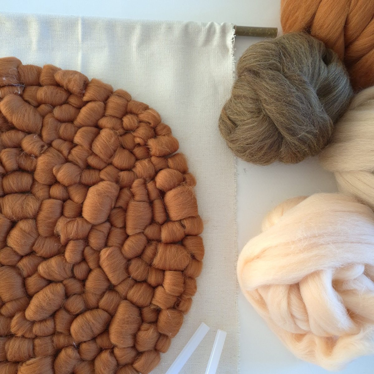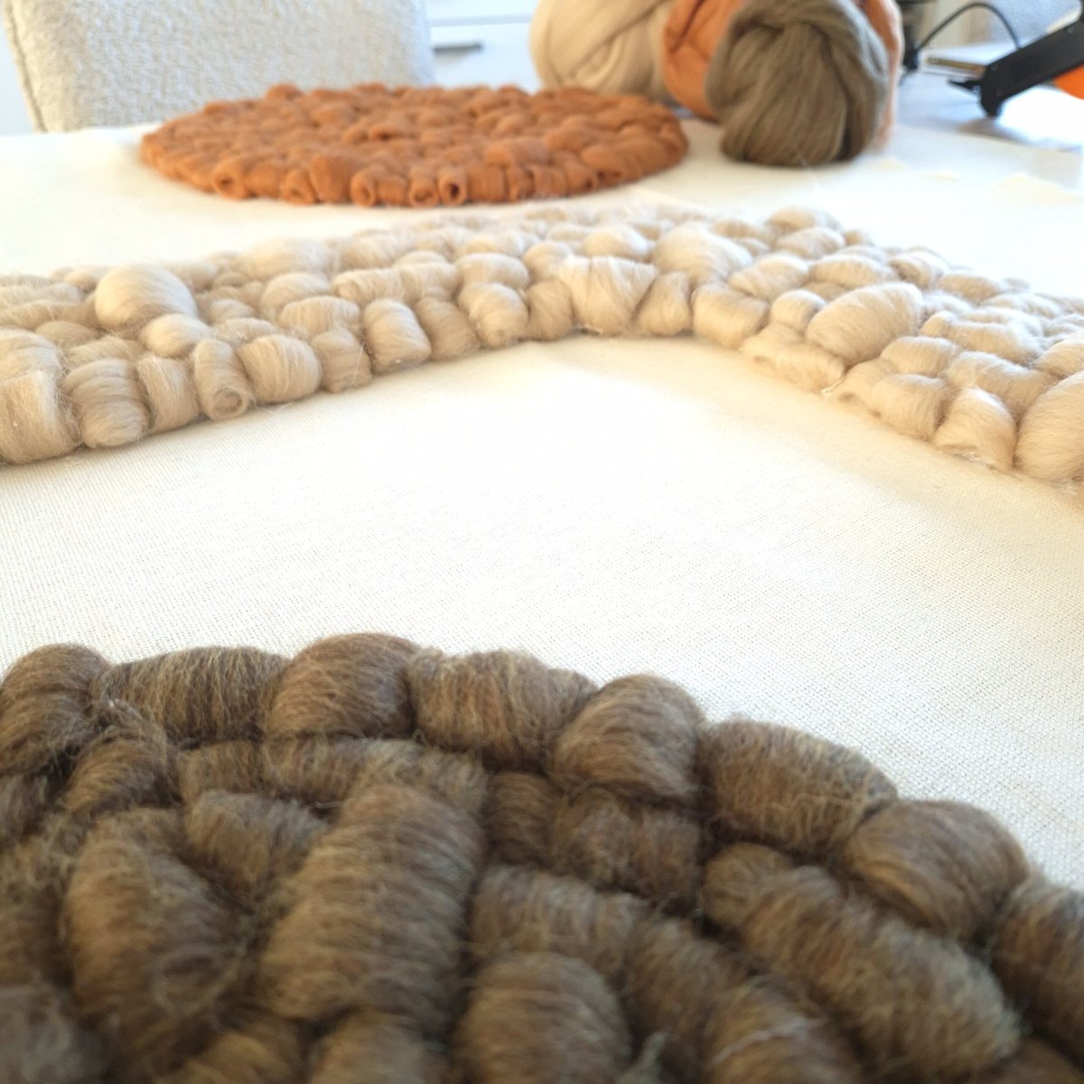 Materiaal: Lontwol in diverse kleuren, linnen/katoen canvas, bamboe stok, touw, lijm