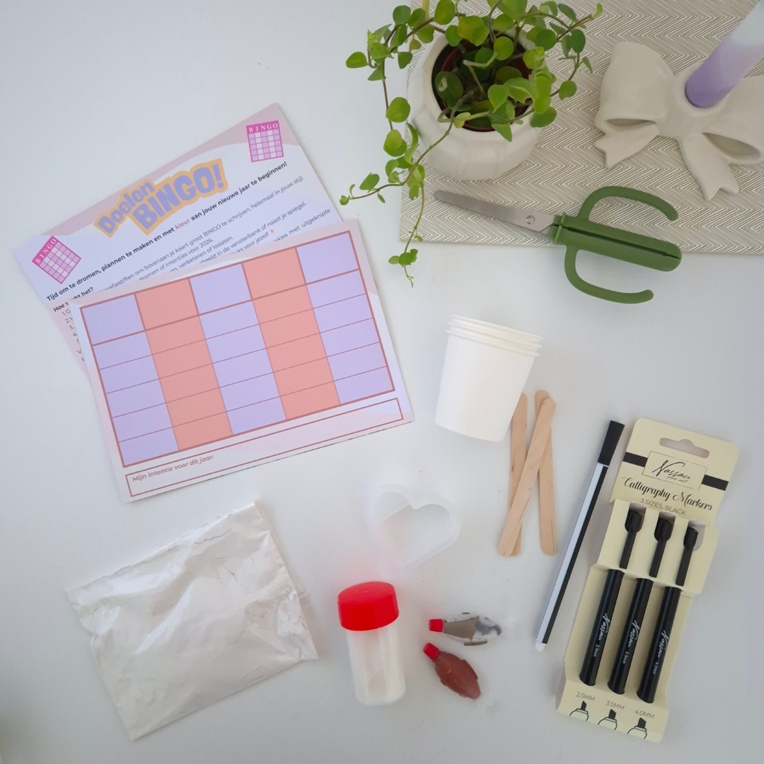 Deze keer ga je aan de slag met de januari box. En deze box gaat je ook helpen om je dromen en doelen voor 2026 op een rijtje te zetten & waar te maken. We maken prachtige kaartenhouders in de vorm van een hart. Perfect voor je BINGO doelen kaart!