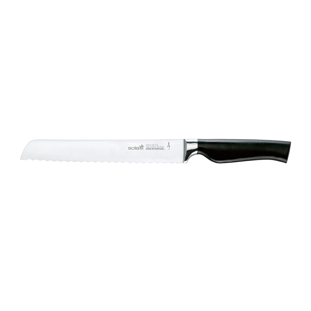 Dit broodmes is gesmeed uit één stuk hoogwaardig Duits molybdeen staal, wat zorgt voor een stevige en duurzame constructie. De ergonomische handgreep is gemaakt van POM-kunststof en is naadloos aan het lemmet bevestigd voor optimale hygiëne. De gesmede krop, de verdikking tussen het lemmet en het handvat, zorgt voor een veilige grip en een goede balans. De afwerking combineert hoogglans en mat in een zilveren en zwarte kleurstelling. Dit mes is gefabriceerd in Portugal.