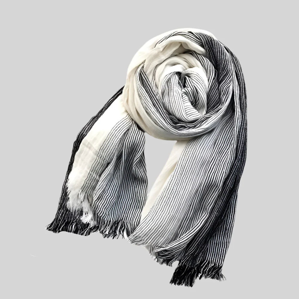 De Cann sjaal is jouw stijlvolle metgezel voor zonnige dagen en zomerse avonden. Gemaakt van een luchtige mix van katoen en linnen, en voorzien van subtiele maritieme strepen, straalt deze sjaal nonchalante elegantie uit. Perfect voor een wandeling langs de boulevard of een cocktailmoment aan zee. Het lichte gewicht en het royale formaat maken hem zowel praktisch als charmant – draag hem losjes over een overhemd of gewikkeld rond je nek voor extra flair.