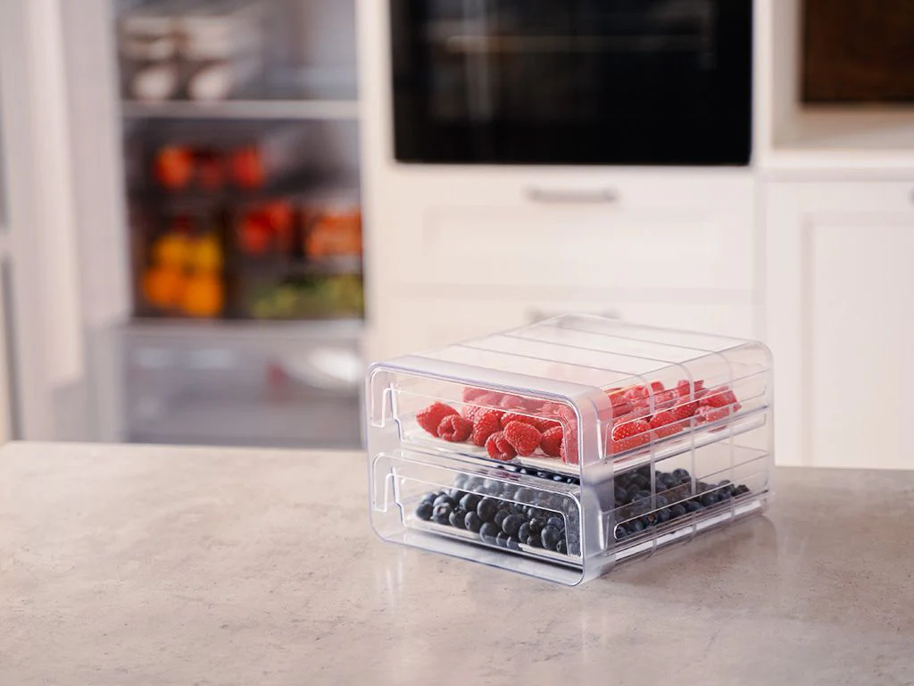 Sommige dingen in je koelkast lijken altijd te verdwijnen – vleeswaren, verse bessen, snackzakjes – snel verstopt achter grotere items of naar achteren geschoven. De ONYX COOKWARE™ DUBBELE LADEN ORGANIZER maakt een einde aan die chaos. Met twee transparante lades die soepel glijden, krijg je overzicht over kleine etenswaren die normaal zorgen voor wanorde. Elke lade is perfect van formaat voor fruit, kaas, vleeswaren of snackrepen. Als extra slimme functie wordt elke lade geleverd met een uitneembare inzet met drainage. Overtollig vocht van bijvoorbeeld gewassen fruit of groente kan zo weglopen – en je eten blijft langer vers en knapperig.