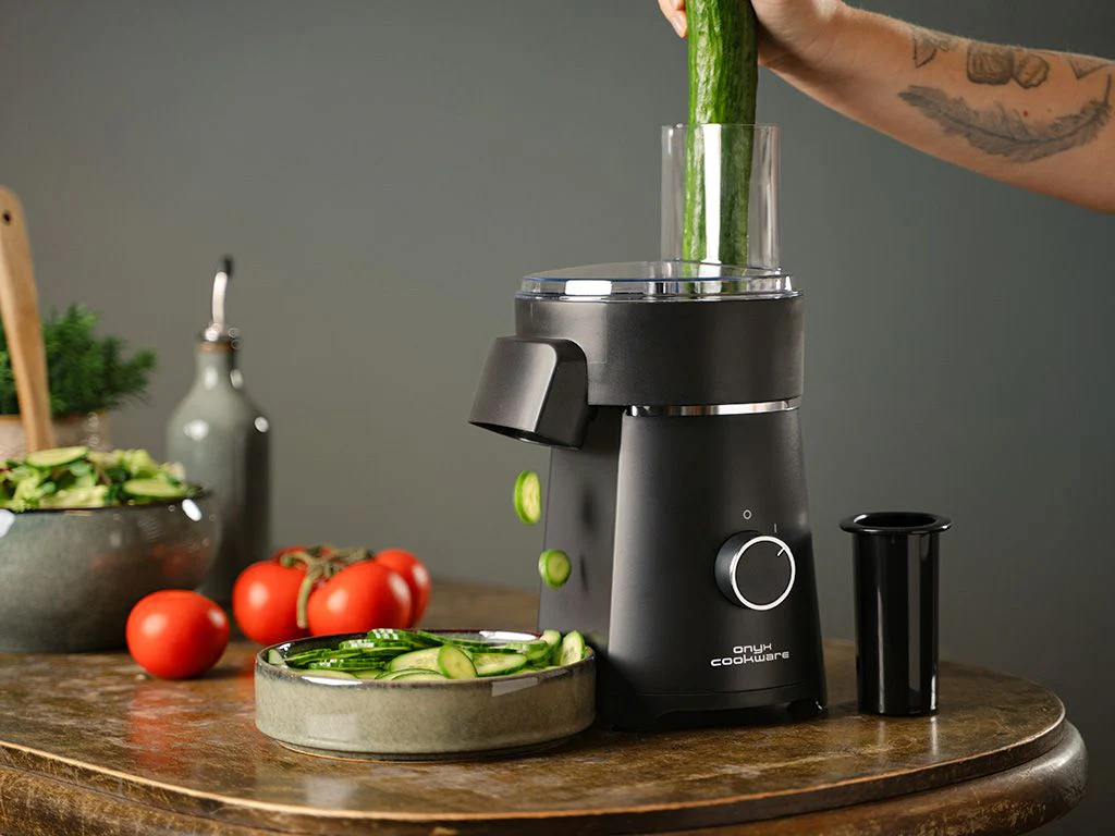 Met de ONYX COOKWARE™ ELEKTRISCHE GROENTESNIJDER wordt het werken met groenten minder omslachtig en veel eenvoudiger – zodat je kunt genieten van elke stap van het koken, van voorbereiding tot serveren.