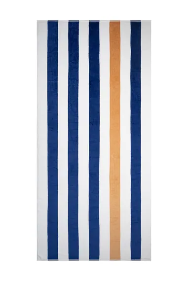 Kom in zomerse sferen met het gestreepte strandlaken van 90 x 190 cm. Het jacquard geweven strandlaken zorgt voor een uniek ingeweven design in twee kleuren. Er zijn vier strepen in marineblauw en één streep in goudgeel.