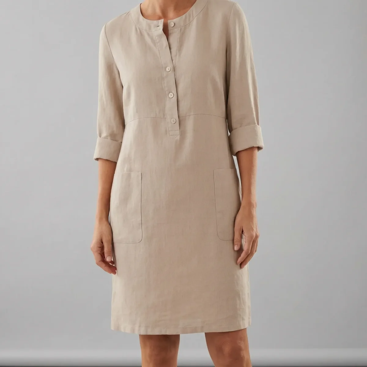 Het kan lastig zijn om een jurk te vinden die comfortabel én verzorgd oogt op warme dagen. Deze tuniek lost dat op door een ademende stofmix die koel aanvoelt en een ontspannen rechte pasvorm biedt. De ronde hals met knoopsluiting geeft opties voor verschillende looks. Handige voorzakken voegen praktische functionaliteit toe zonder het silhouet te verstoren.