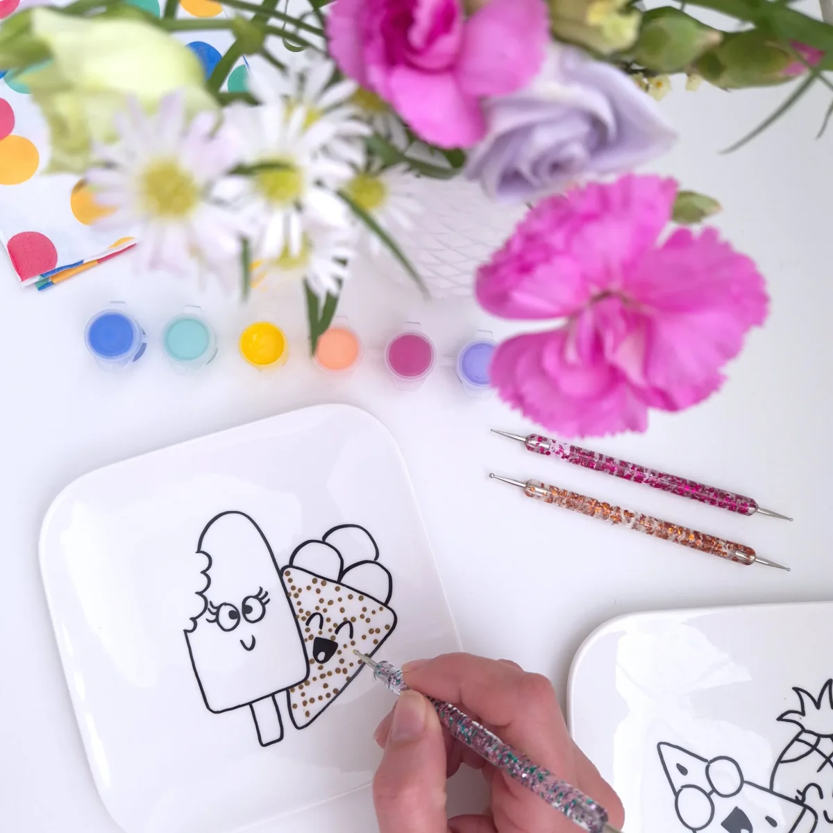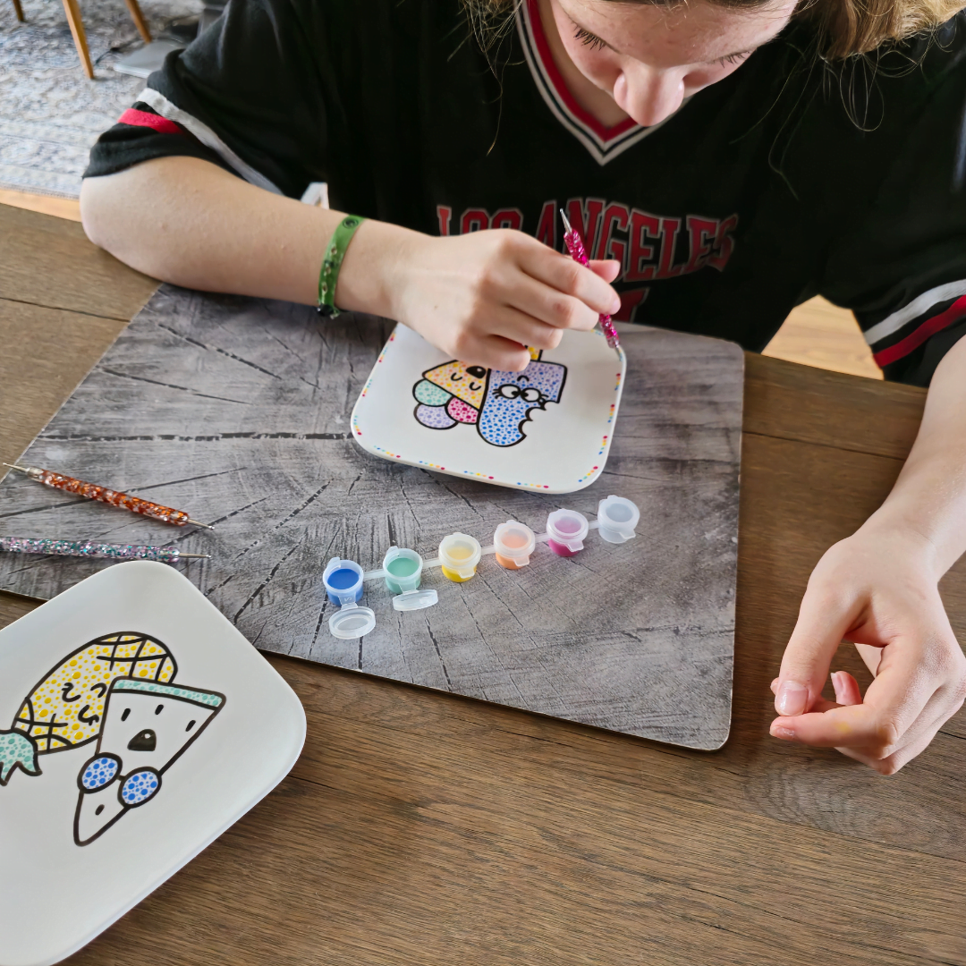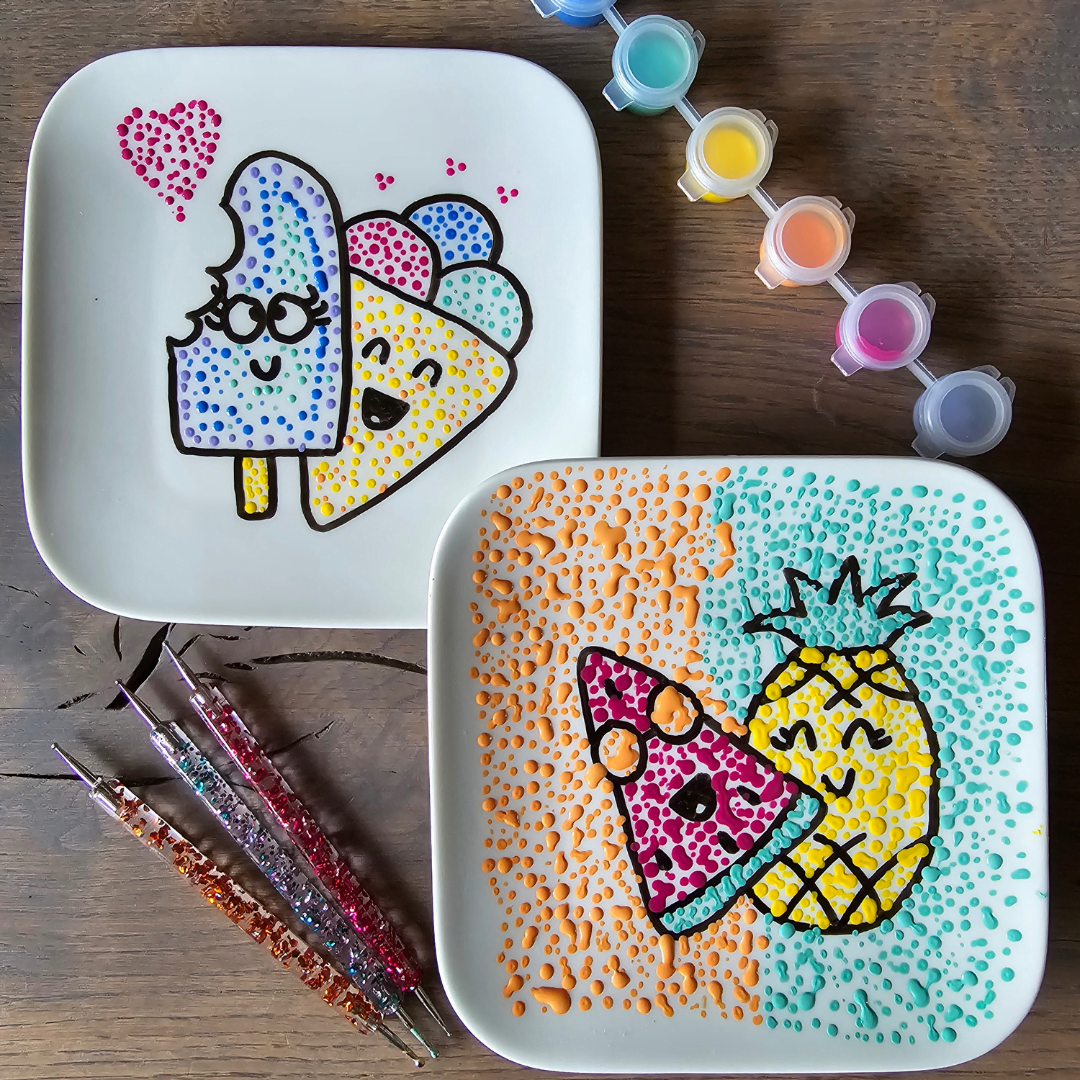 In de box zitten twee bordjes met een leuke vrolijke print. Deze kunnen de kids makkelijk versieren. Heb je de smaak te pakken? Hier volgen een aantal tips voor het dot painten: