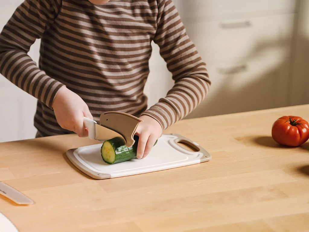 Stel je dit voor: je kind staat enthousiast naast je in de keuken, mes in de hand, klaar om te helpen bij het bereiden van het eten. Samen maken jullie een fruitsalade of een stevige groentesoep. Het roestvrijstalen lemmet glijdt moeiteloos door bananen, komkommers of zelfs wortels, terwijl de ergonomische greep en het lichte ontwerp zorgen voor nauwkeurige en gecontroleerde sneden. Dankzij de geïntegreerde beschermschede zijn de vingers van je kind bij elke snede veilig, zodat jullie je allebei kunnen richten op de plezierige ervaring van samen koken.