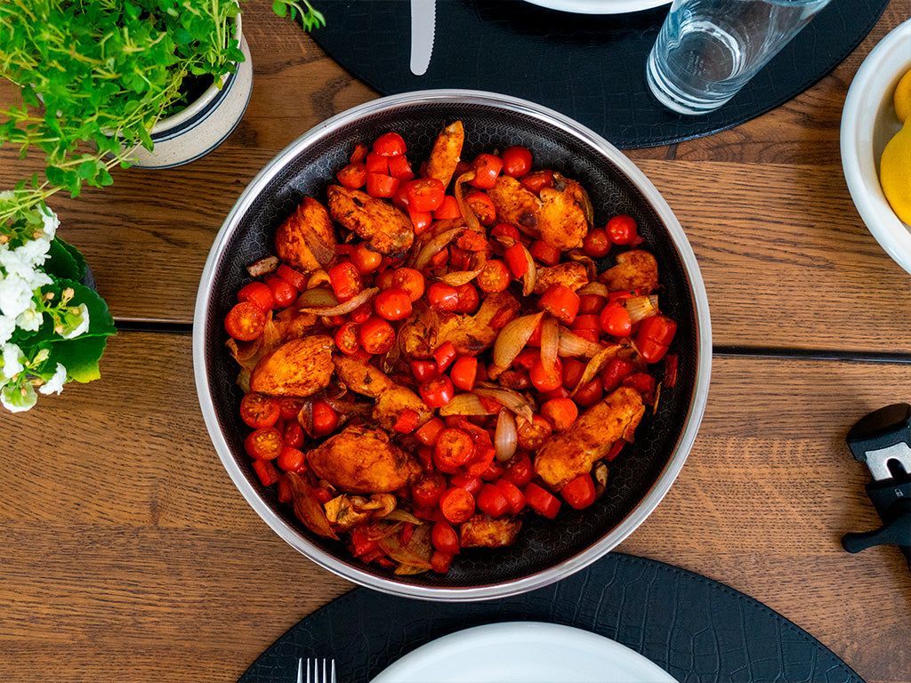 grote koekenpan van 28 cm gevuld met vlees en groenten, of welk gewenst gerecht dan ook, te hanteren.