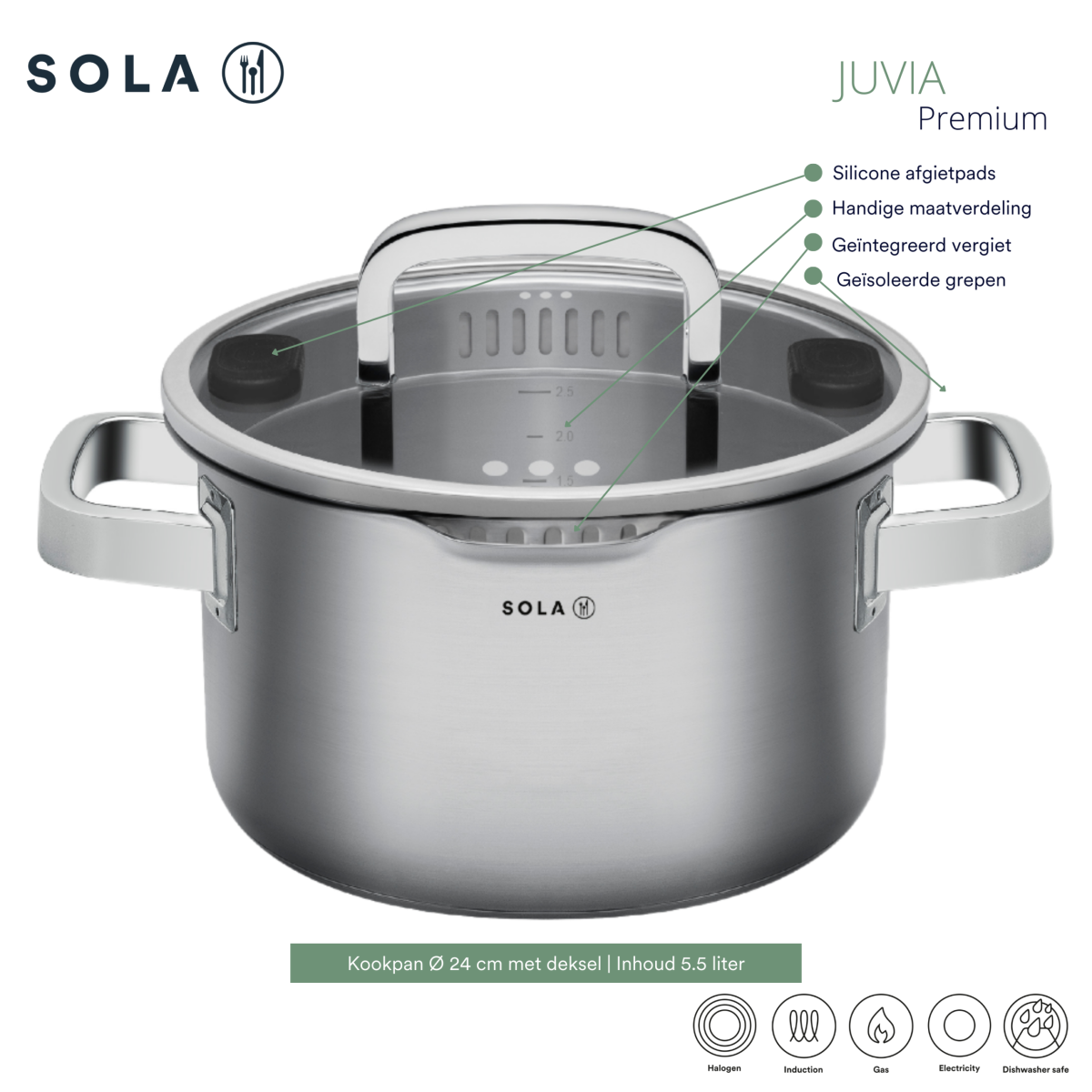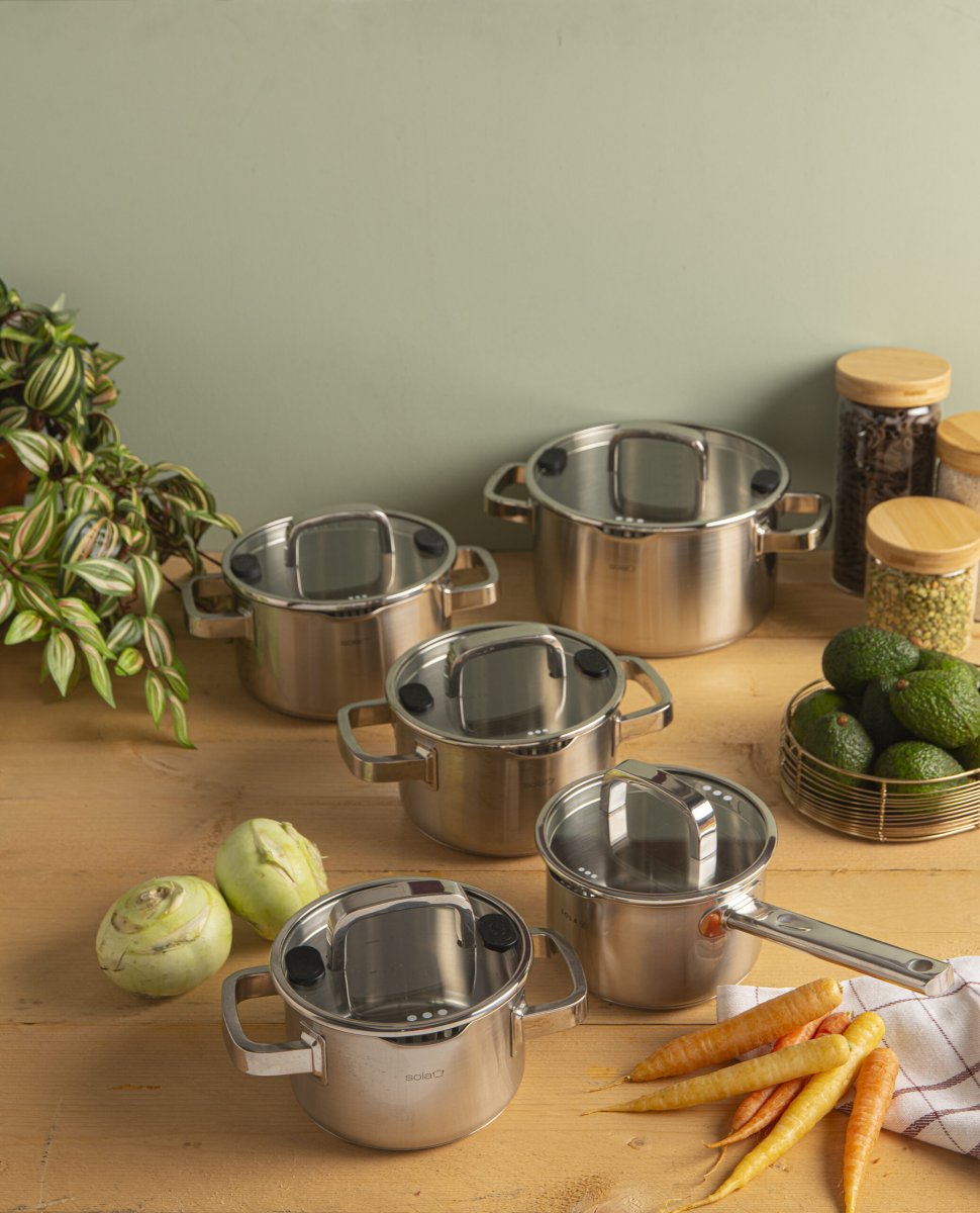 De Sola Juvia kookpan met een diameter van 24 cm is een betrouwbare en praktische pan voor dagelijks gebruik. Met een ruime inhoud van 5,5 liter is deze pan ideaal voor het bereiden van soepen, pasta’s of aardappelen voor het hele gezin. De pan is vervaardigd uit hoogwaardig roestvrijstaal, wat zorgt voor een solide basis in uw keuken.