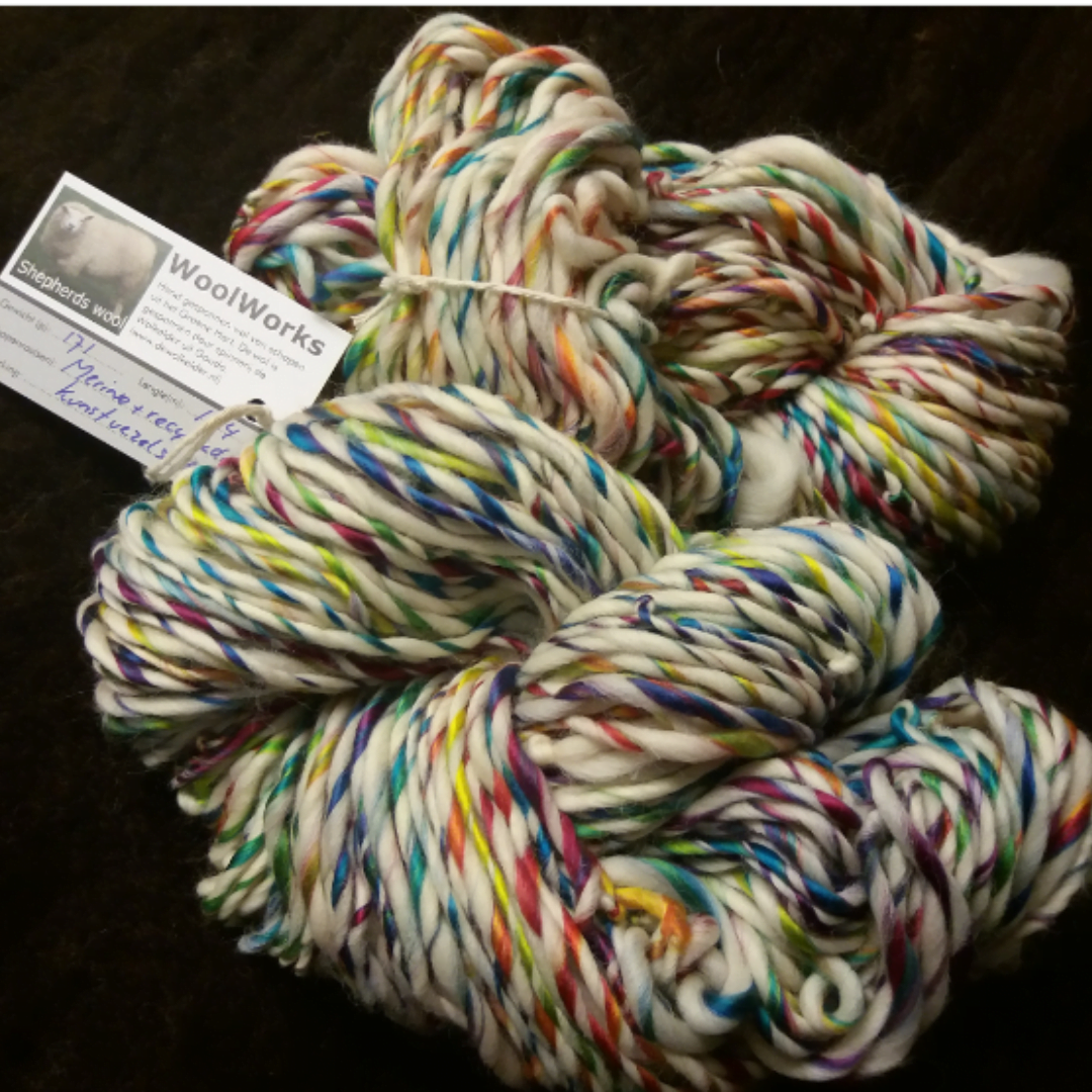 Verder misschien nog leuk en handig om te weten. Een meter lontwol is 25 gram. Een kilo lontwol is ongeveer 40-50 meter. Omdat de wol fluffy is, kun je de wol makkelijk laten rekken. Wanneer je te hard trekt, trek je de vezels uit elkaar en is het lont onderbroken. Je kunt lontwol eenvoudig aan elkaar zetten met een platte knoop in het breiwerk. Of gebruik een schuursponsje en een speciale viltnaald en punch zo de vezels weer aan elkaar.