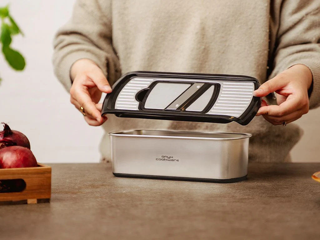 Met de ONYX COOKWARE™ Multifunctionele Groentensnijder hak, snijd en schaaf je snel en eenvoudig – helemaal zonder gebruik van messen, snijplanken of extra gereedschap. Of je nu uien fijnhakt, aardappelen in plakjes snijdt of wortelen julienneert, deze alles-in-één oplossing klaart alles effectief en moeiteloos.
