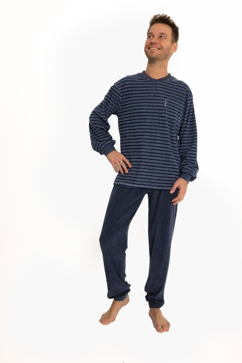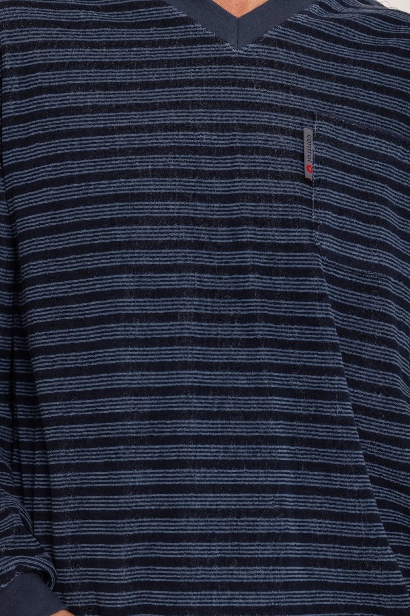 Deze Outfitter pyjama met lange mouwen en lange broek voor heren is uitgevoerd in zachte sponsstof met fijne strepen, voelt meteen warm aan en blijft toch luchtig. Het V-hals shirt heeft ribboorden aan hals en mouwen voor een verzorgde zoomafwerking, terwijl de effen broek soepel valt voor ongehinderd loungecomfort. Verkrijgbaar in blauw en grijs – jouw snelle keuze voor cosy avonden. 😌