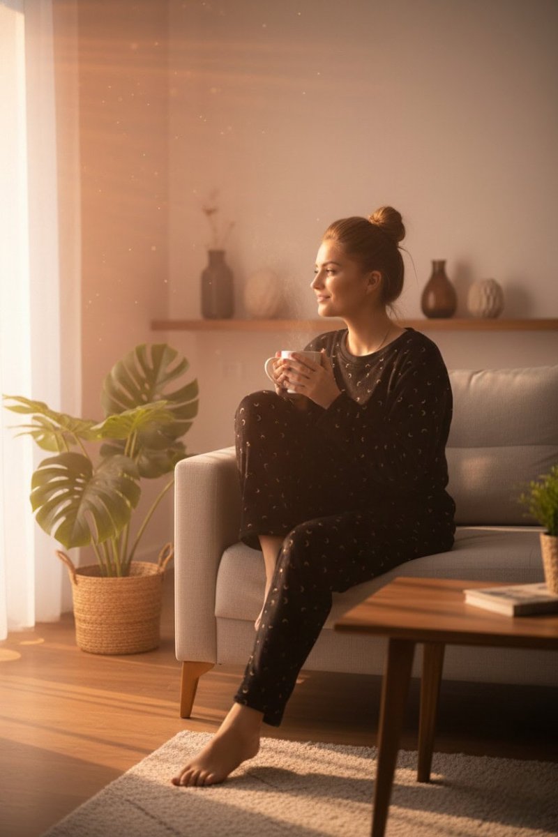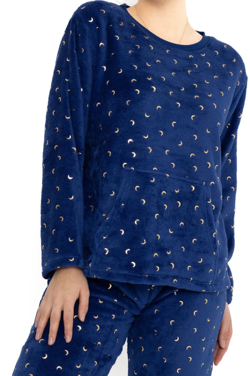 Deze pyjama voor dames van Cocodream is vervaardigd uit heerlijk zacht fleece en omhult je tijdens de koude herfst- en winteravonden met behaaglijke warmte. Het bovenstuk heeft een ronde hals, lange mouwen én een handige kangoeroezak voor extra comfort. De bijpassende lange broek met rechte pijpen en elastische taille biedt optimale bewegingsvrijheid. Beide delen zijn voorzien van een subtiel moons-dessin in fonkelend goudaccent dat zorgt voor een speels én stijlvol detail. Verkrijgbaar in de kleurvarianten zwart en blauw. Perfect voor knusse nachten en warme ontspanning ✨