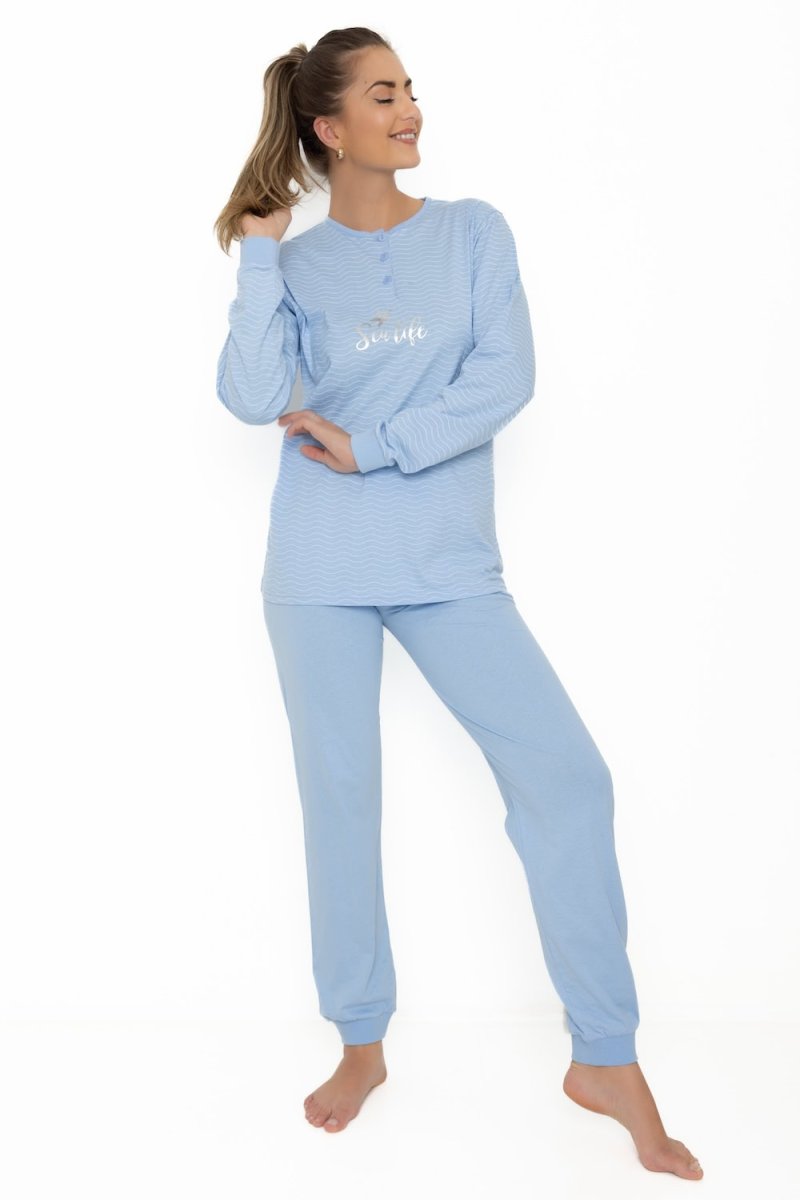 Deze comfortabele pyjama van het merk Cocodream is vervaardigd uit zacht katoen, wat zorgt voor een optimaal ademend vermogen en een heerlijk draagcomfort. De set, bestaande uit een top met lange mouwen en een bijpassende lange broek, heeft de perfecte lengte voor een elegante en ontspannen pasvorm. Met zijn speelse “Sea Life” tekening en verfijnde afwerking biedt deze pyjama een uitstekende kwaliteit voor een zeer voordelige prijs.