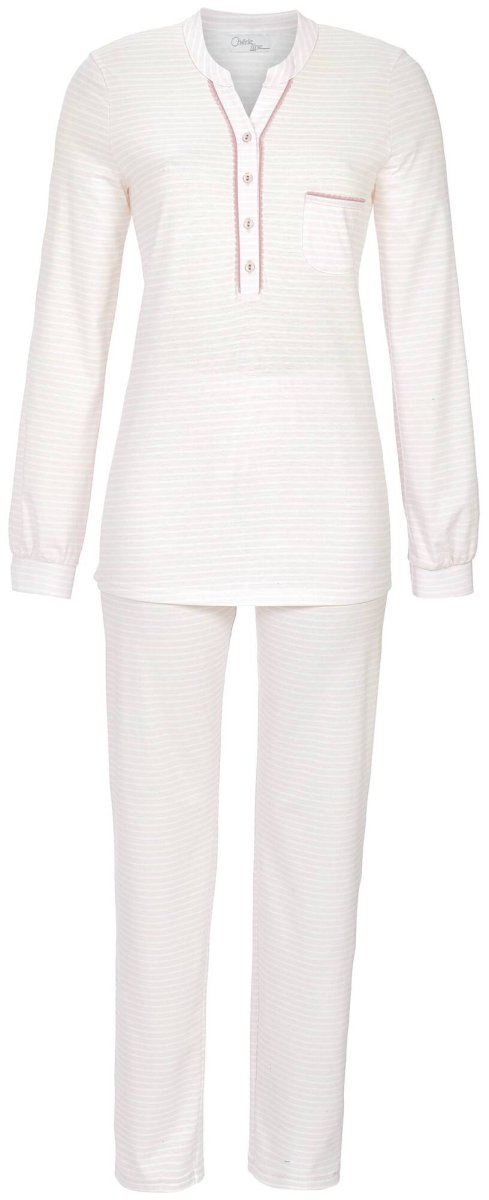 Deze zachte damespyjama van Ringella Chérie Line straalt subtiele elegantie en comfort uit. Het lange model met fijne roze-witte streepjes is afgewerkt met verfijnde details zoals een halflange knoopsluiting, een sierlijk biesje langs de hals en een borstzakje. De lange mouwen en broek zorgen voor warmte tijdens koelere nachten, perfect voor de herfst- en wintermaanden. Gemaakt uit een aangename, soepele stof die heerlijk aanvoelt op de huid.
