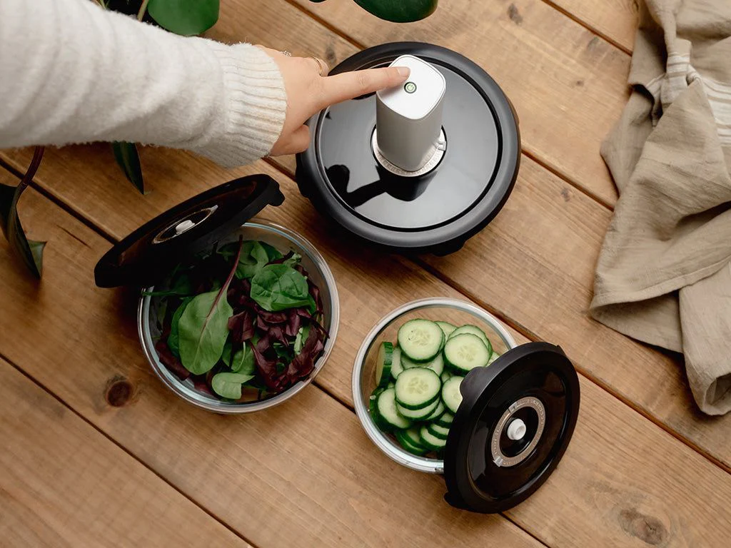 De vacuümverpakking bewaart uw voedsel tot vijf keer langer. Gebruik de vacuümpomp om een vacuüm te creëren; in enkele seconden hebt u uw voedsel vacuüm getrokken en kunt u het gebruiken wanneer u het nodig hebt. Het slimme ontwerp maakt het mogelijk om de bakjes op elkaar te stapelen zodat er meer ruimte overblijft in de koelkast voor andere boodschappen. Op de bovenzijde van het deksel zit een handmatige datumaanduiding, zodat u altijd kunt zien wanneer het voedsel vacuüm werd getrokken.