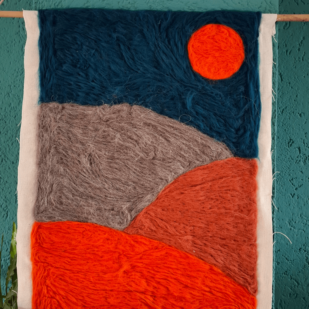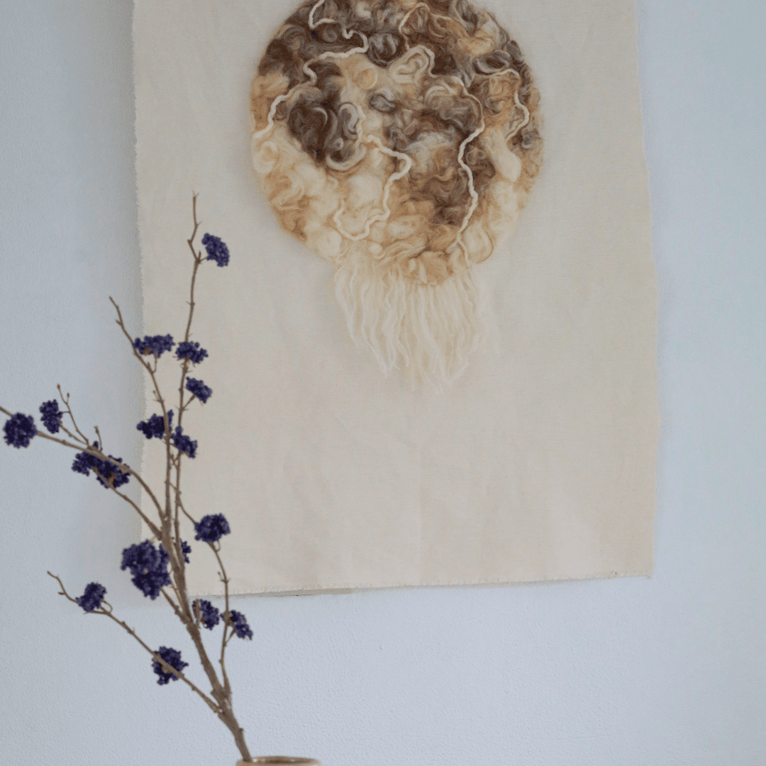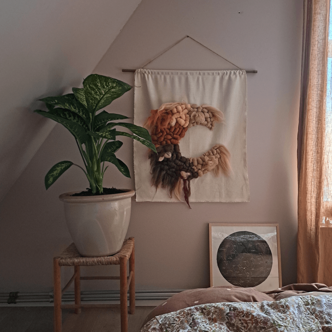 Het is een ideale stof om te combineren met lontwol. Je kunt de wol erop lijmen of prikvilten. Deze stof zit ook in de complete box “Wanpaneel van lontwol”.