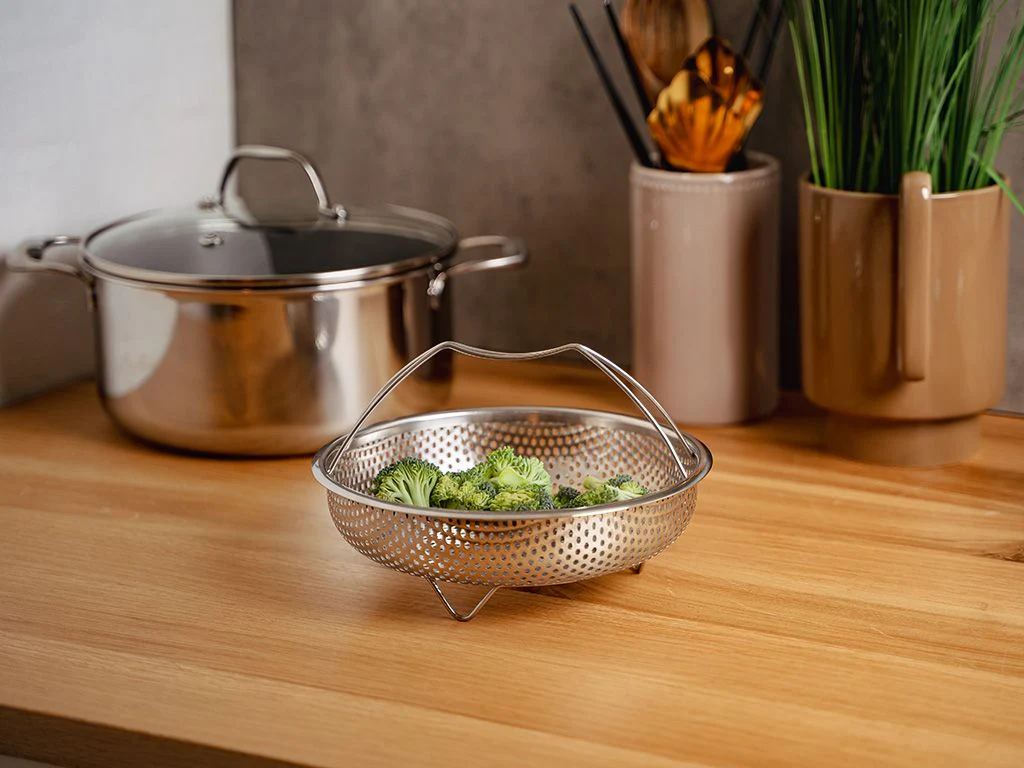 De kleine gaatjes in de bodem zorgen voor een gelijkmatige stoomverdeling, zodat alles zacht en precies gaart – zonder vorm of smaak te verliezen.Plaats de inzet in een pan met een laagje water, voeg je ingrediënten toe en dek af met een deksel om de stoom vast te houden.De opvouwbare handgreep maakt het eenvoudig om hem in en uit de pan te tillen – en nog eenvoudiger om op te bergen. Of je nu snel kookt doordeweeks of voor het hele gezin voorbereidt – de ONYX COOKWARE™ STOMERINZET zorgt voor gezonde resultaten zonder rompslomp.