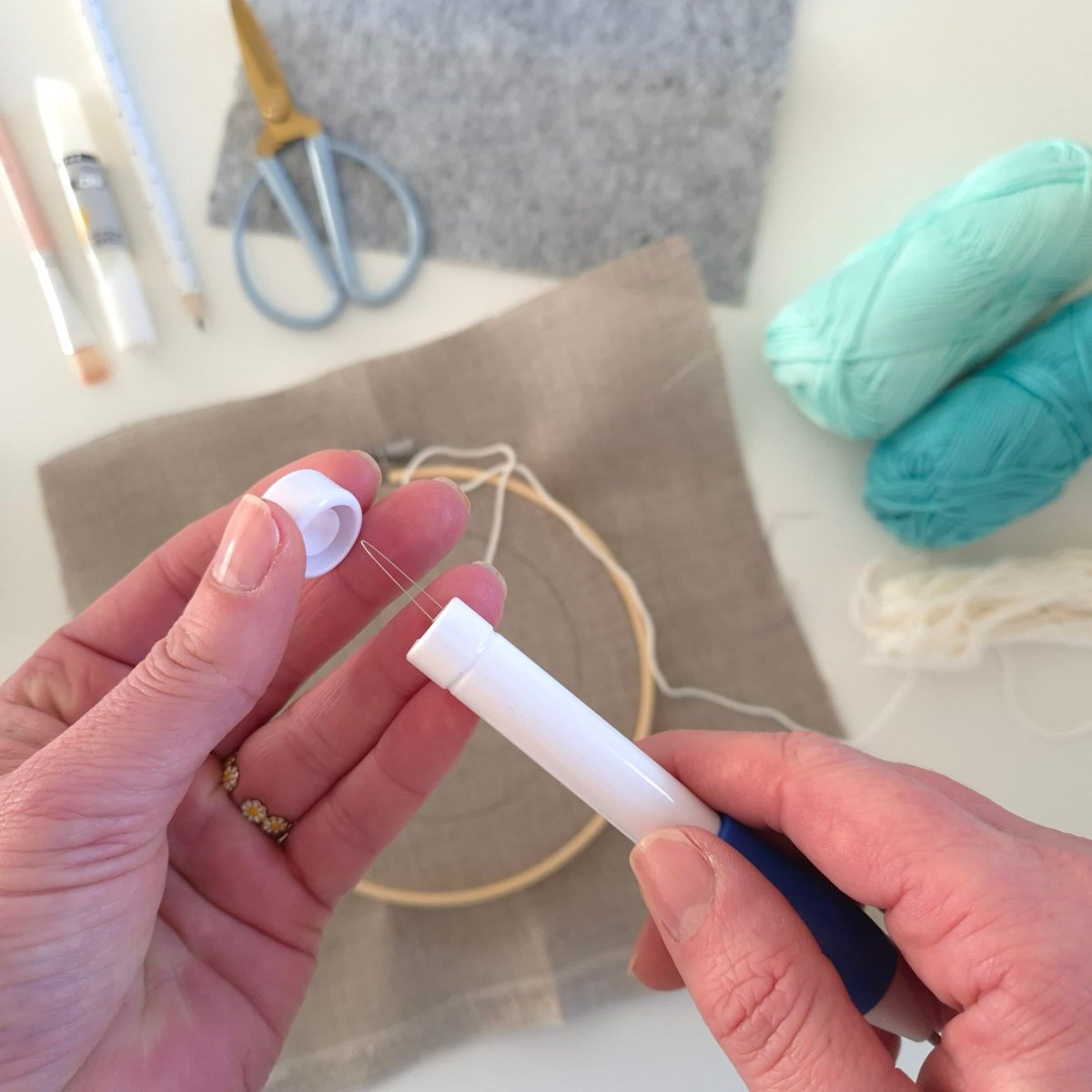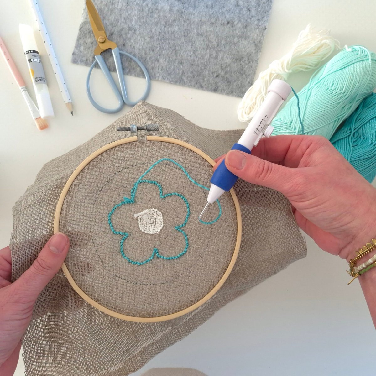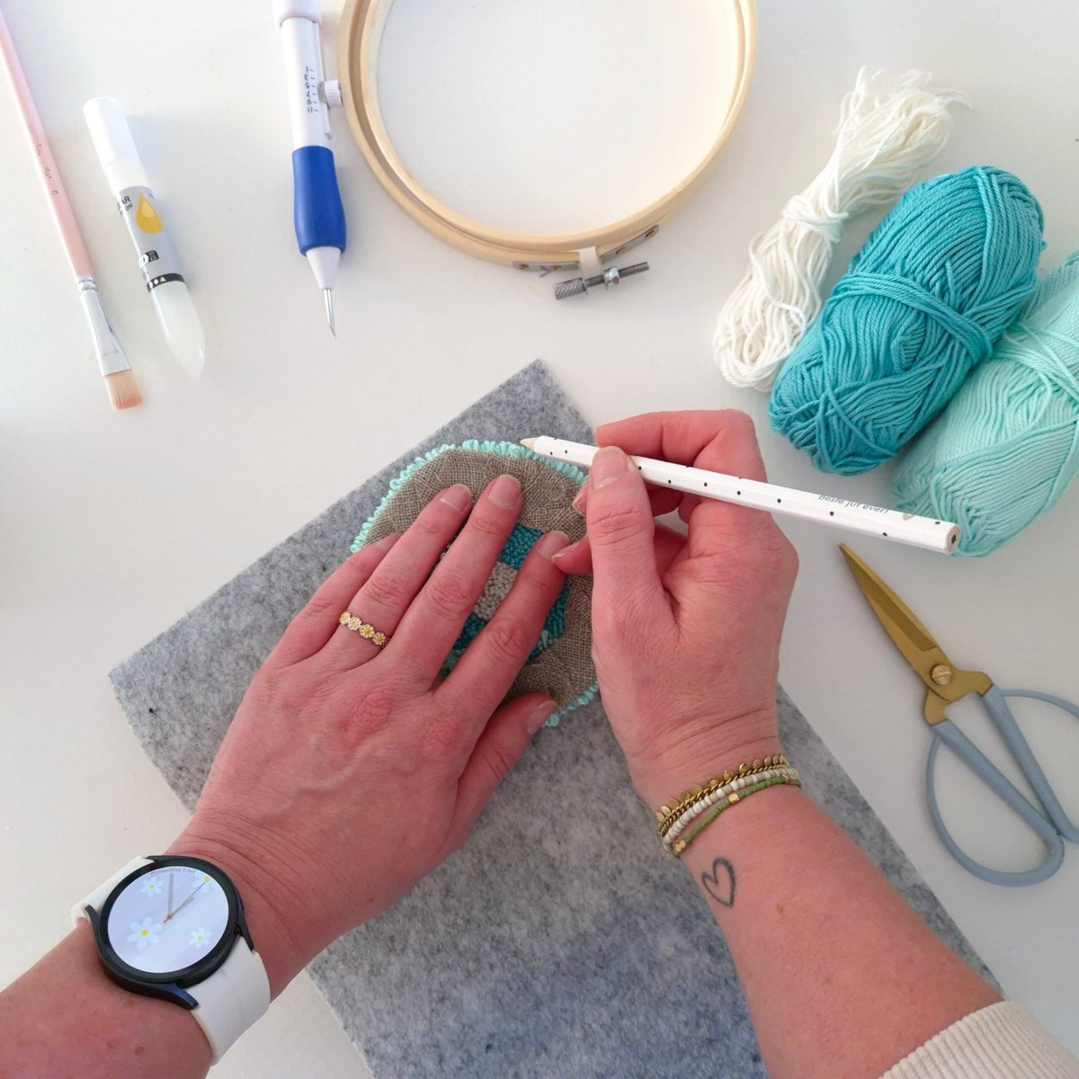 - Lijmpistool en een lijmstift. Of je kunt een multi-lijm met een kwast gebruiken (zie Basis Video III: Hoe je je punch needle borduurwerk afhecht?).