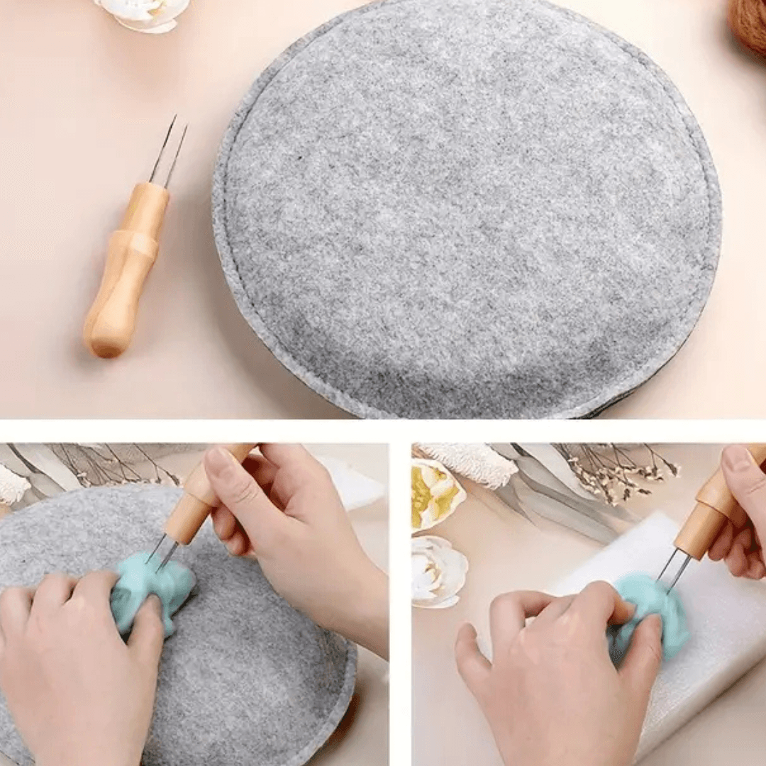 De naald is heel breekbaar dus maak bij het droog vilten / prik vilten / naald vilten gebruik van een sponsje. Een sponsje is een voordelig alternatief voor het prik vilten. Je kunt ook gebruik maken dit mooie wollen vilt matje of een vilt borstel. Deze zijn er in allerlei prijsklasses en vind je bij gereedschappen voor lontwol.