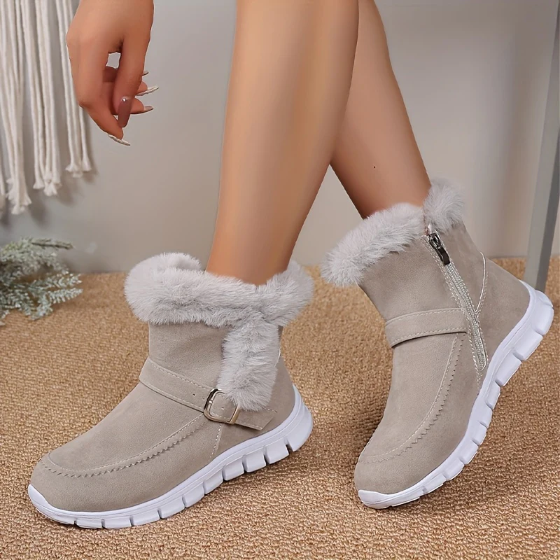 Deze heerlijk gevoerde enkellaarzen zijn jouw beste vriend tijdens gure dagen. Met een warme pluche voering, een handige ritssluiting en een comfortabele pasvorm bieden ze alles wat je nodig hebt om stijlvol én warm de winter door te komen. De subtiele fluffy rand geeft een speelse touch, terwijl de stevige rubberen zool zorgt voor grip en stabiliteit op elk terrein.