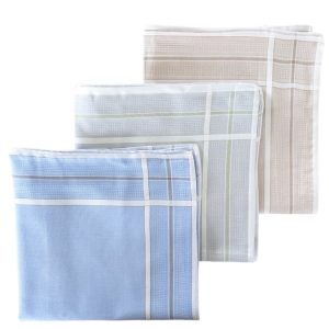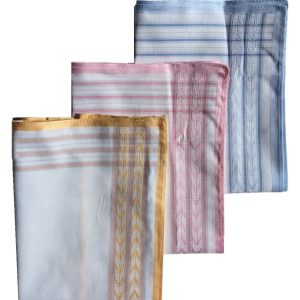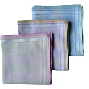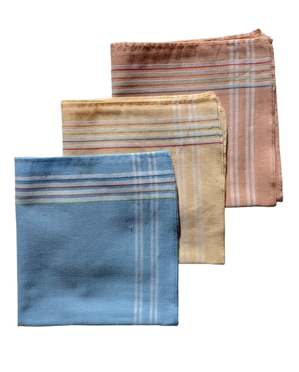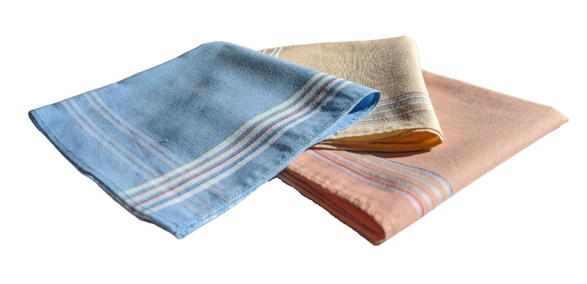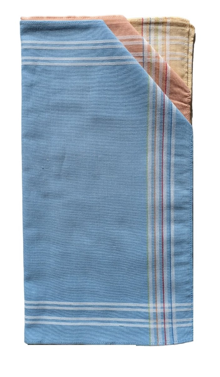 Zakdoek Manon gekleurde fond blauw – geel – koraalroze (per 6) 30×30