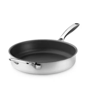 Deze textuur is natuurlijk wat de pan zijn antiaanbak eigenschappen geeft. Het vermindert de hoeveelheid direct contact dat je voedsel met het oppervlak heeft, zodat het gemakkelijk loslaat en sneller schoonmaakt. En omdat deze laag deel uitmaakt van het staal zelf, is er niets dat kan slijten of beschadigen. Alle drie lagen – het staal, het aluminium en het nano-getextureerde oppervlak, zijn permanent samengesmolten. Niet gelijmd, niet gecoat, niet geperst. Gewoon solide metaaltechniek gemaakt voor dagelijks koken met maximale prestaties.